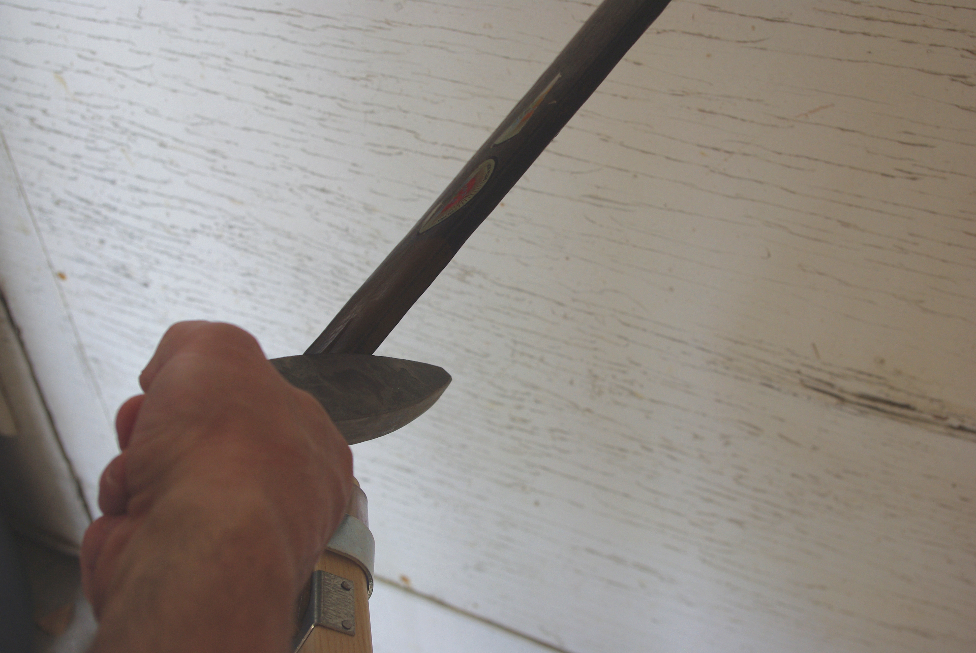 However, the concept of sharpening is the same, on all cutting tools, the thinner the edge the less resistance any kind of blade has to get into any material and we achieve that “thinner-ness” by reducing the angle of the edge by closing the V at the top. And we obtain that new shape by removing equal amount of material from both sides of the blade (with a stone in this case) that is sharpening. The farder back we go removing material, the smaller the angle and the sharper the blade will be, but also will get dull sooner and the cycle begin again. This is relatively easy on most axes or knifes however, when sharpening a scythe blade we have to keep in mind that on top of the three clearly visible curves there is another factor making it even a bit more complicated and that is the extra irregular additional angle of the edge.
