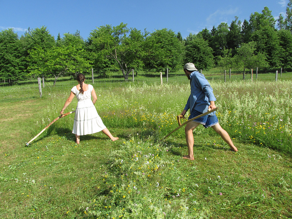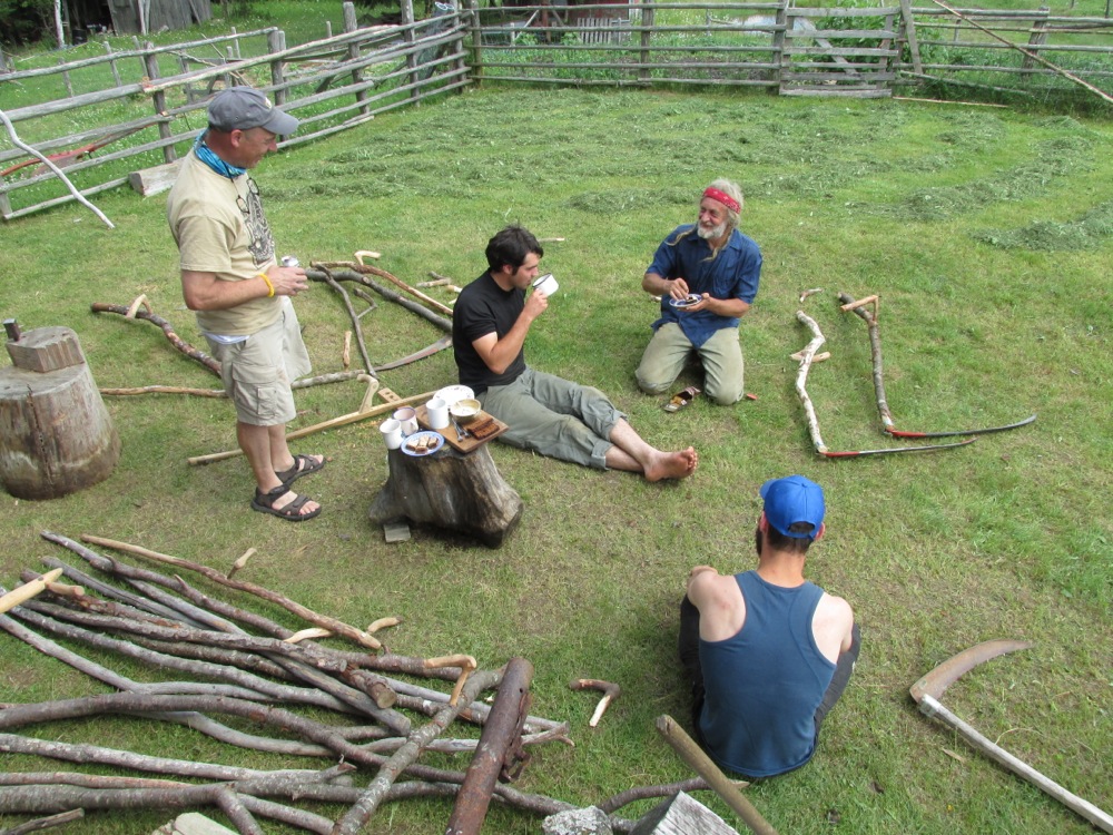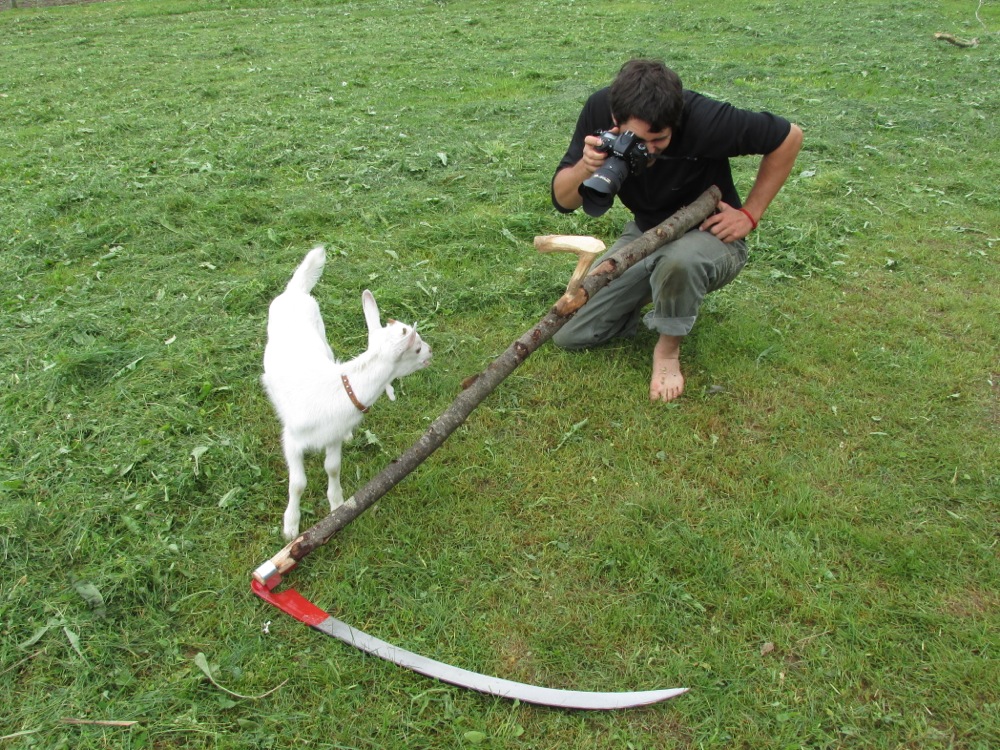 IMG_0231 Well, finally after a few weeks of absence trying to catch up on accumulated tasks left behind due to my trip north to New Brunswick, Canada, where I spent a few intense days of what I like to call the North American Scythers Summit (NASS, not to be confused with the space agency), I would like to say, first, thanks to the Vido family for hosting graciously, openly and generously a group of scythe enthusiasts from around the world with different points of view, needs, and backgrounds. All, however, shared a common interest: promote and use the scythe in the 21st century. IMG_0192 I never saw before so many kinds of blades, from different makers, countries, styles to fit different needs of cutting etc… I never saw so many handle grips from natural twisted branches (or probably roots) and for sure, It is not easy to find some one (not only in the scythe world) with such a wide knowledge willing to share it with others. Peter does. IMG_0219 And we had a happy bonus: the friendliest baby goat to accompany all activities. IMG_0238IMG_0229IMG_0234 My long experience with the scythes was always based on work, except for the times that I participated in mowing competitions (that was even harder work). But this time, it was primarily ( but not limited to) about learning how to make snaths out of raw wood or branches of trees, regardless of variety. IMG_0220It was gratifying to see that all other participants were young people with the idea of promoting the use of the scythe in their future.